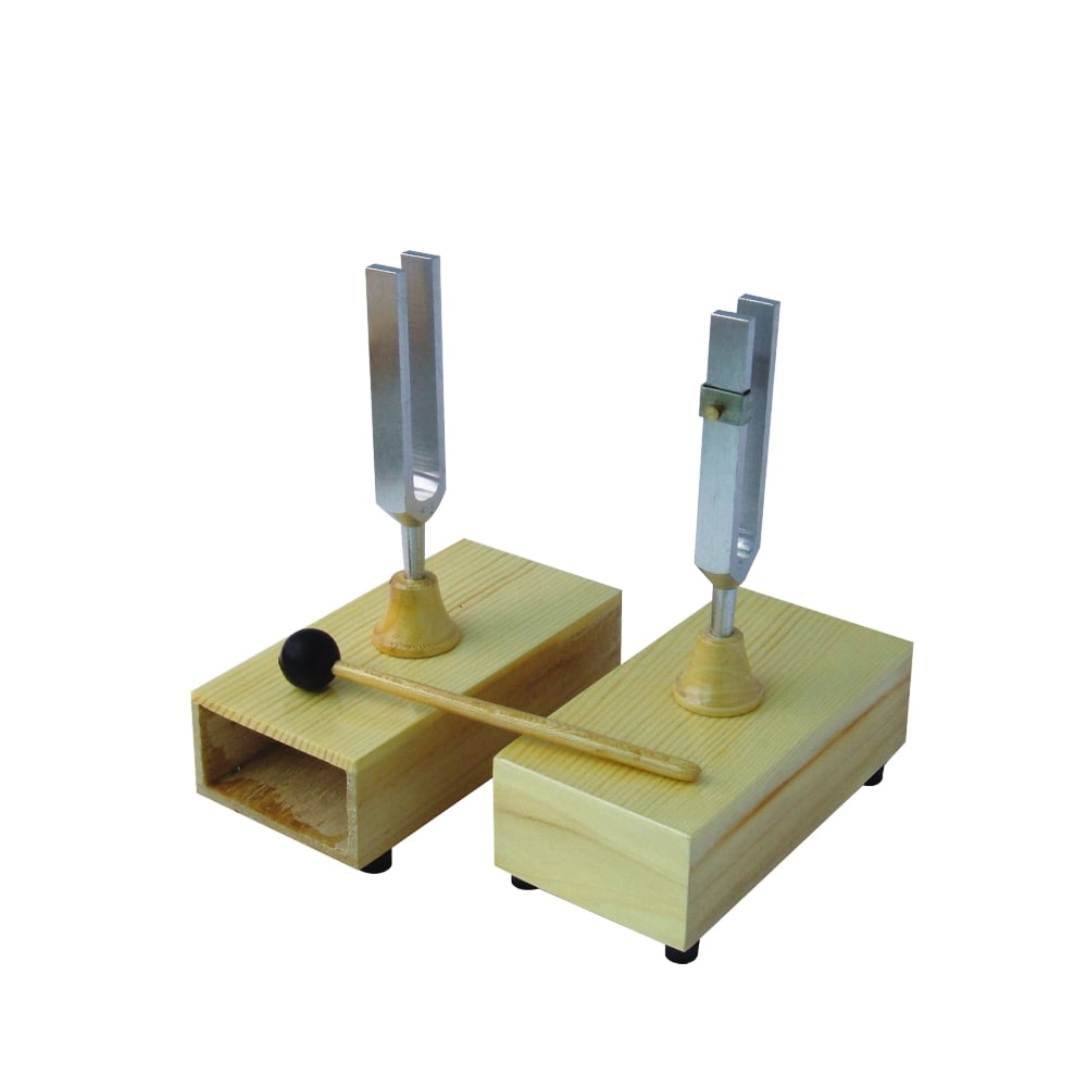 - Εξοπλισμός: Το σετ περιλαμβάνει δύο διαπασών τοποθετημένα σε ανεξάρτητα ξύλινα κιβώτια συντονισμού και ένα σφυράκι μήκους 175mm με λαστιχένια κεφαλή διαμέτρου 25mm για την κρούση.