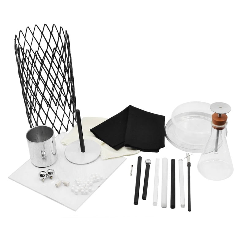 A comprehensive Electrostatic Demonstration Kit for use in showing charging behavior, charge storage, attraction and repulsion, distribution of a charge on surface and induction.