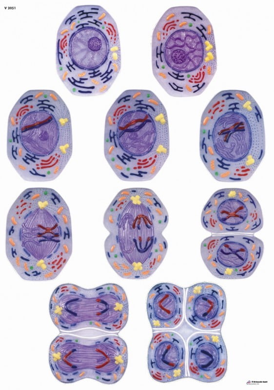 This colorful wall chart details cellular division, meiosis. Mammal cells are used as the template to illustrate the process of meiosis on this oversized chart. The cells on the chart are colored according to the usual staining in microscopy. These charts are a great teaching tool for explaining meiosis, which is vital in sexual reproduction. The posters are supplied with rods for easy display in the classroom.