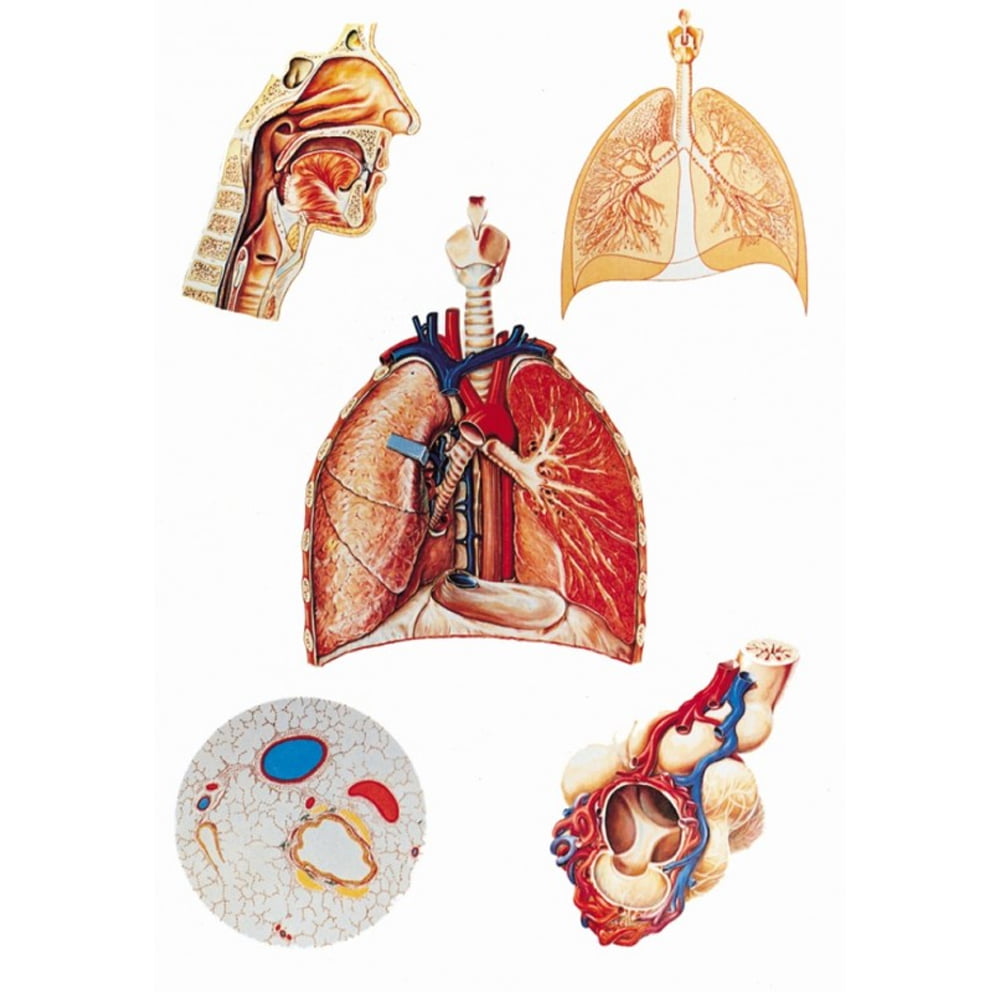 This oversized anatomical chart displays different aspects of the human respiratory system. The colorful illustrations on the poster include the trachea, bronchial tree and the lungs in a median section view. The respiratory organ chart is delivered with rods for easy display in any classroom or doctor&apos s office.