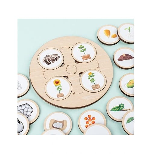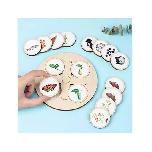 A wooden puzzle representing nature’s plant and animal life. This game includes the life cycle of a butterfly, the life cycle of the common frog, etc.
