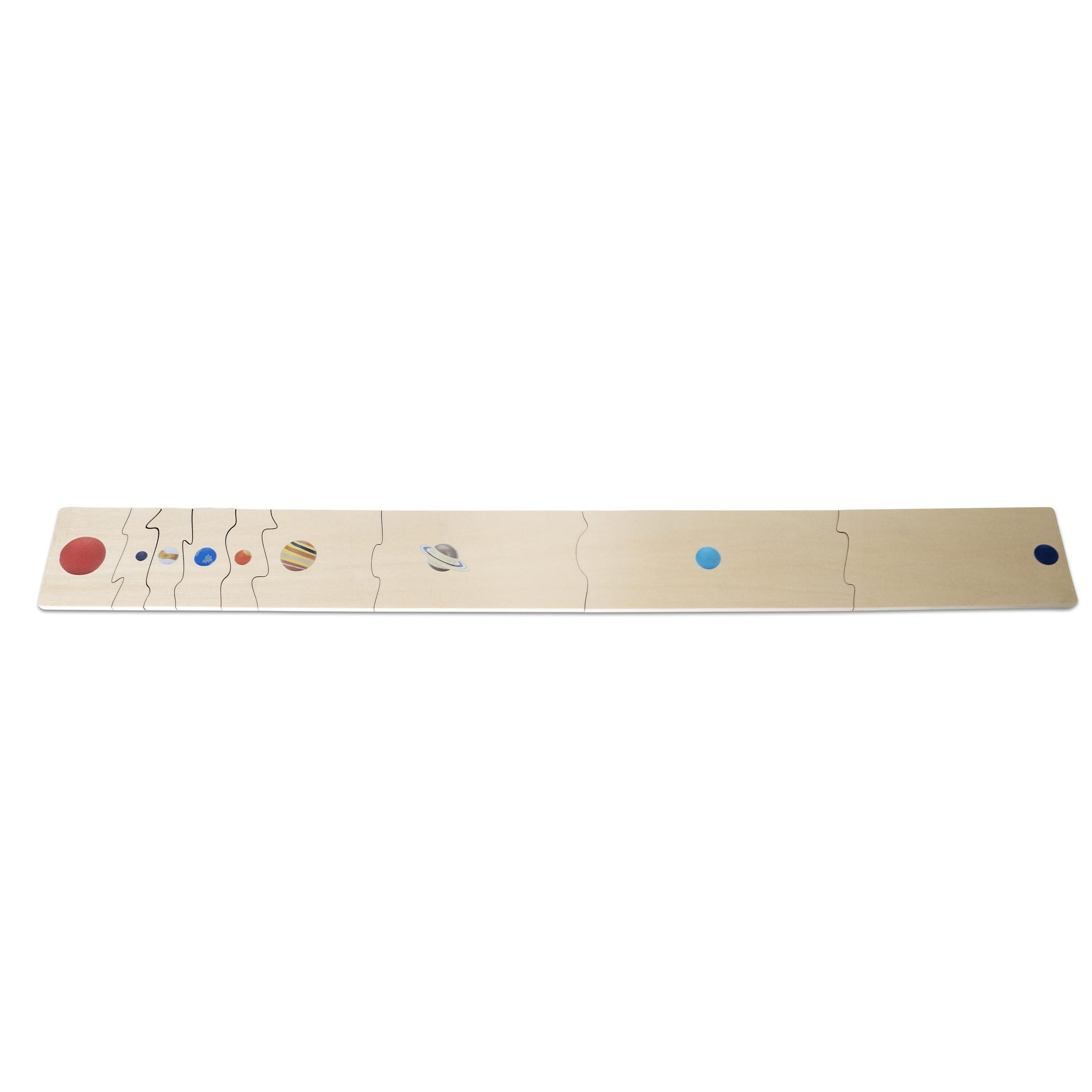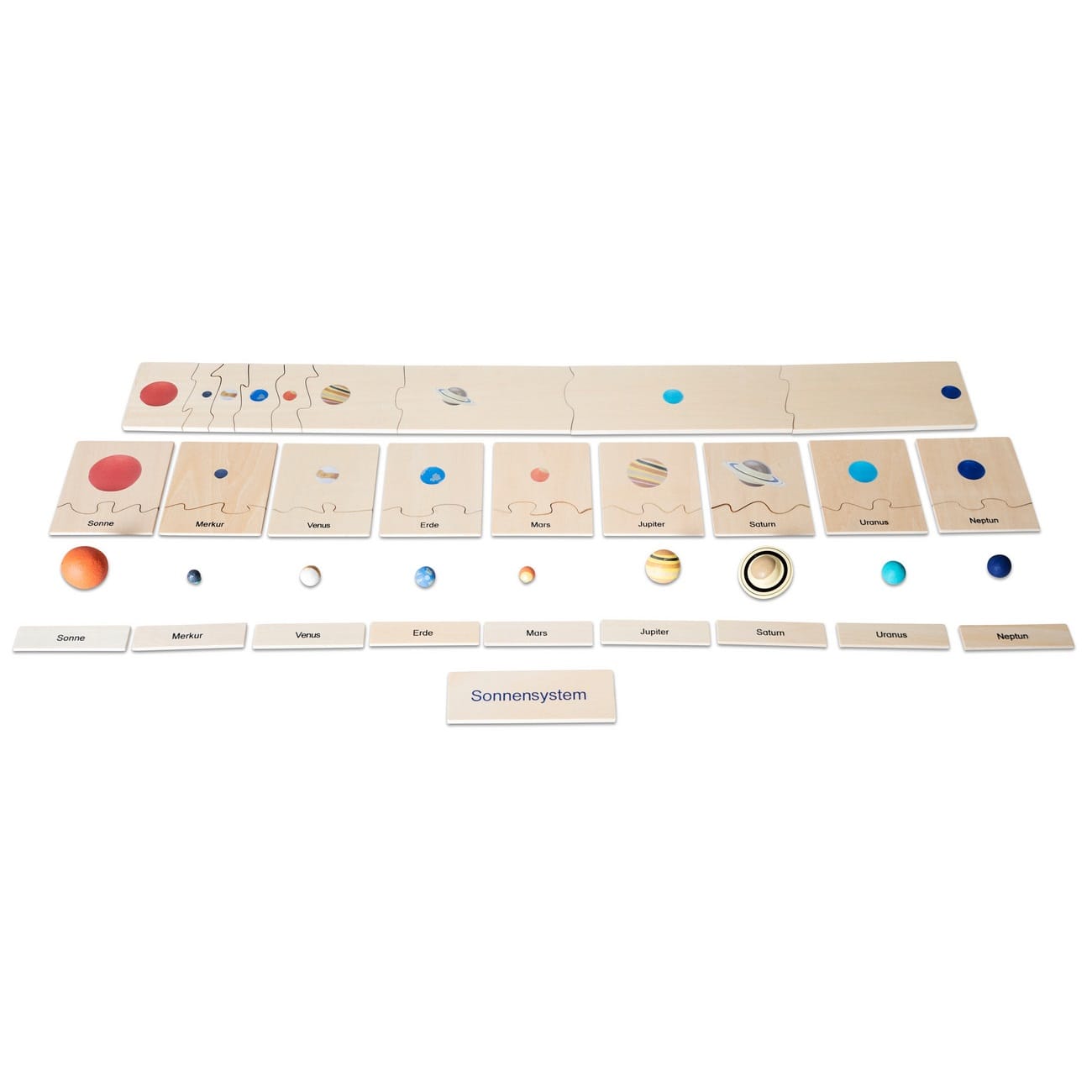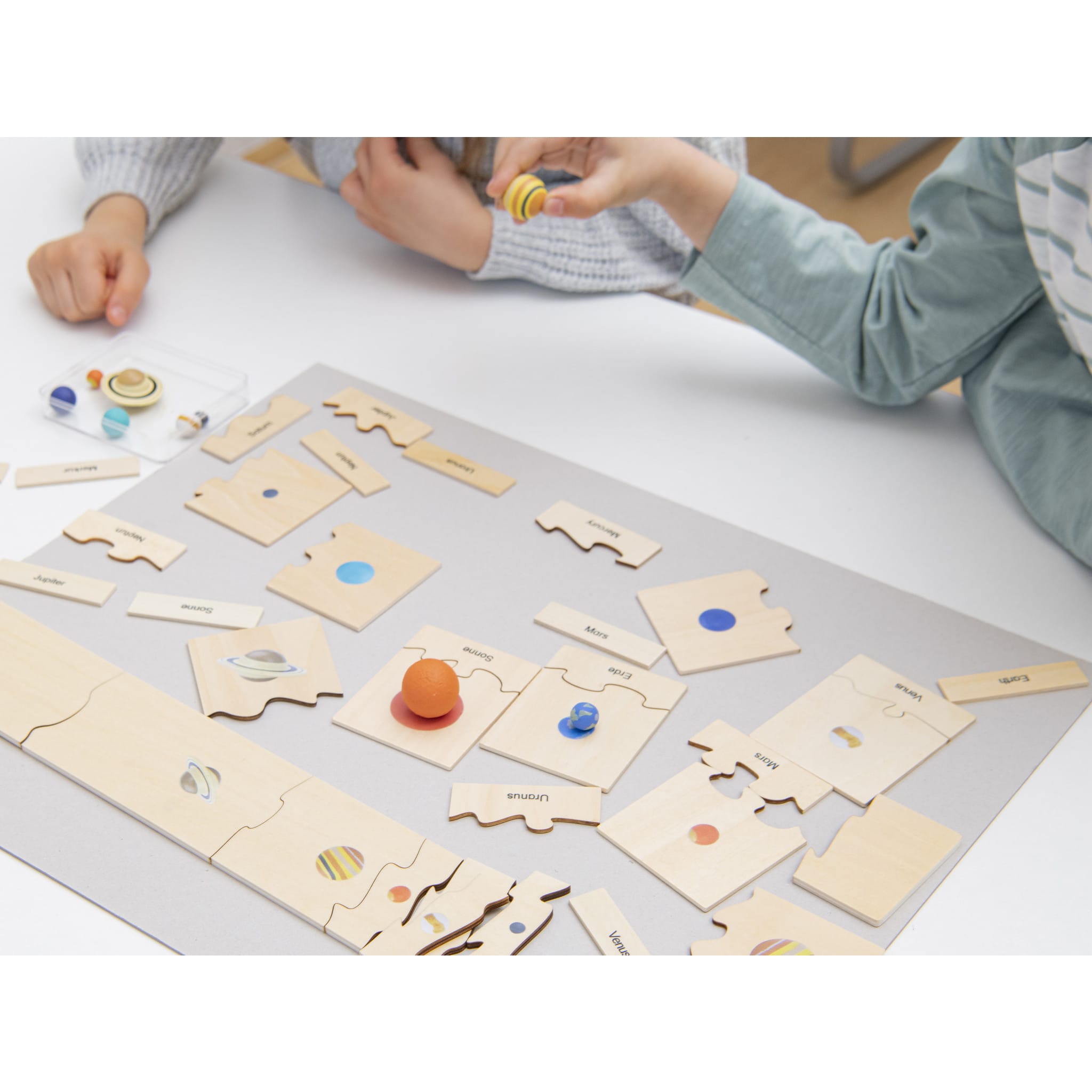When putting together the two puzzle pieces made of hand-flattering wood, they can control themselves and effortlessly memorize the order of the planets and names. There are many opportunities to look at, describe and compare so that the children expand their language skills and vocabulary. The bilingual labeling in German and English reinforces this effect. The little ones also train their concentration, patience and fine motor skills.
