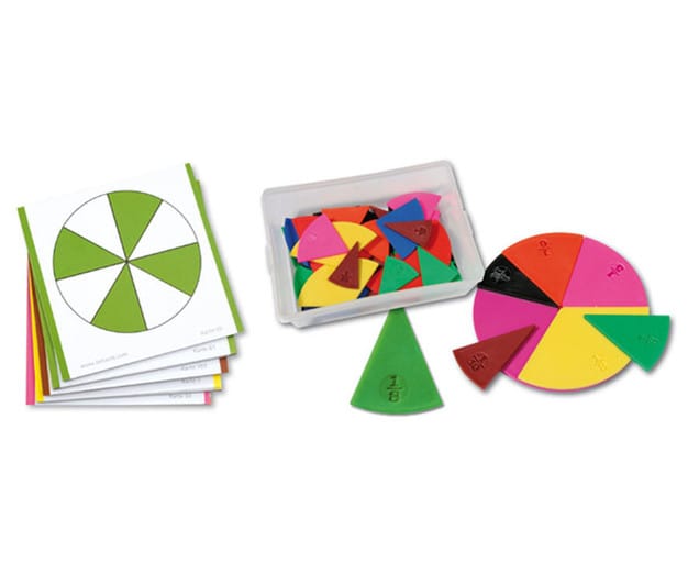 Fractions are shown in a circle or rectangle on the front of the cards. The fraction is a number on the back. The students name the fractions on the front and check their answer on the back. Set of 115 double-sided colored cards (9 x 9 cm)