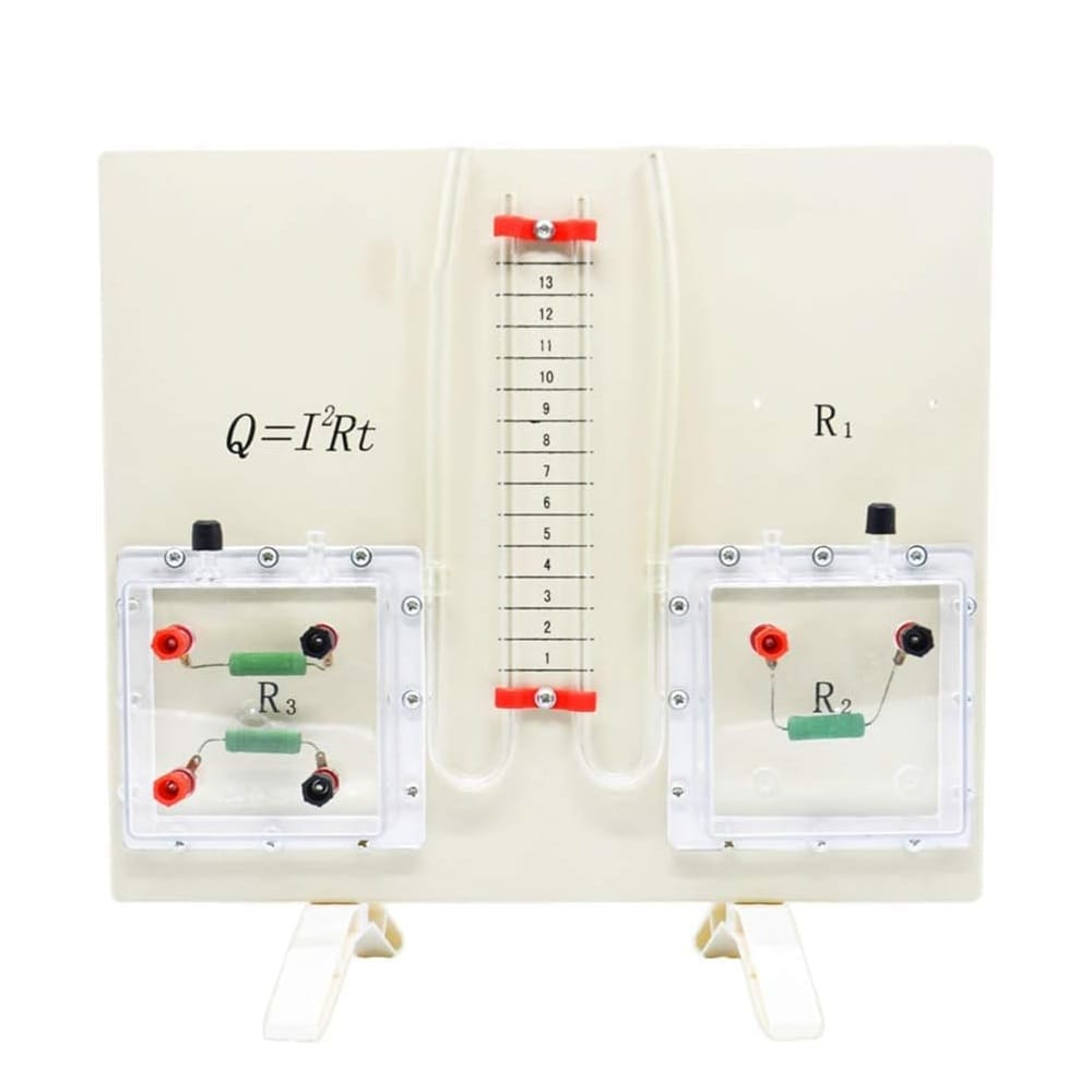 The Joule Law Demonstrator is an educational device used to demonstrate Joule’s Law, which describes the heat produced when electric current flows through a conductor. This device features resistors embedded within transparent containers and tubes, allowing students to clearly observe the heat generated and the temperature change as current passes through the resistors.
