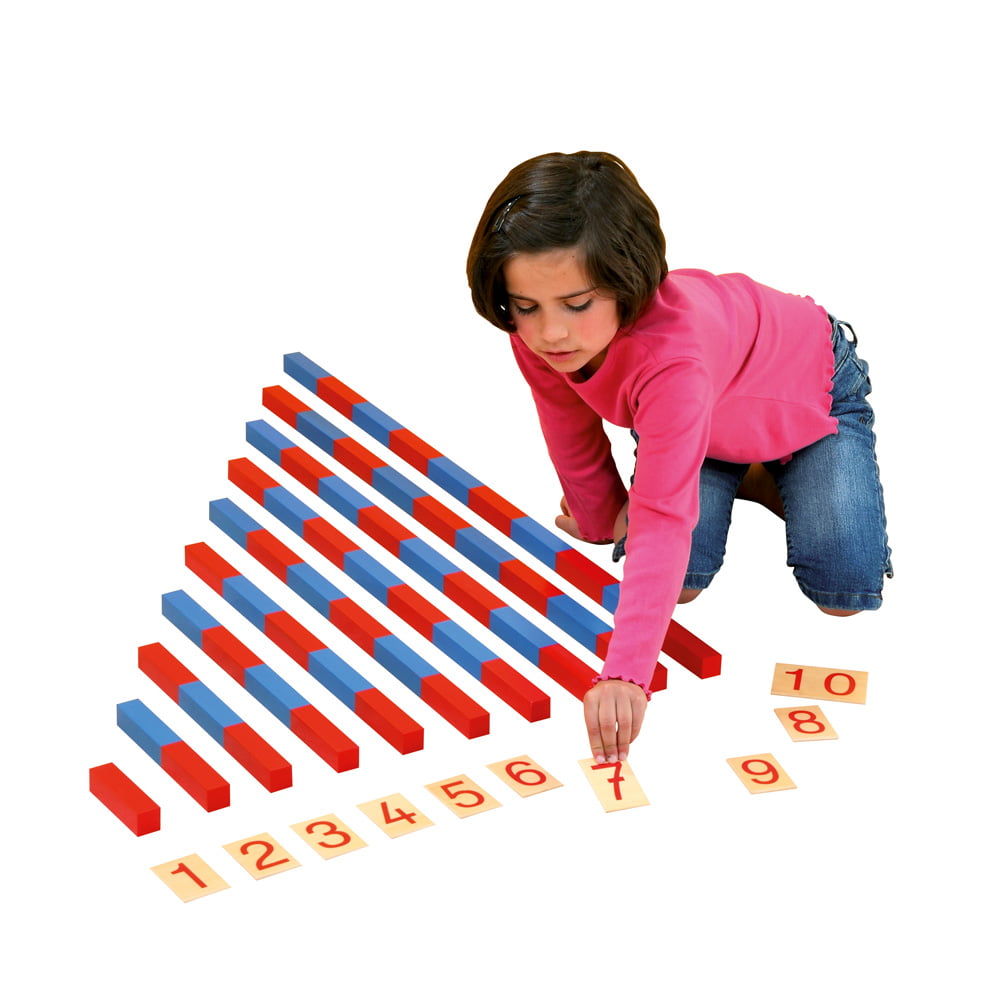 Ten rods, which vary in length from 10 cm to 1 metre by 10 cm increments.