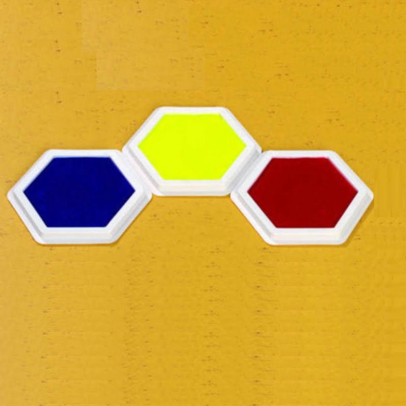 Three inks in blue, yellow, and red. They are used together with geometric stamps or to make children’s posters.