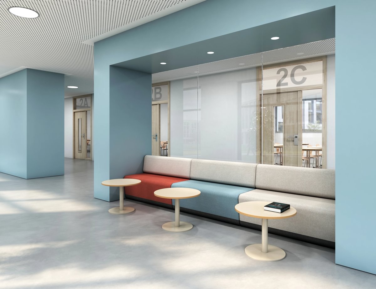 The Kalin Rectangle Complete is a rectangular modular school sofa with backrest, designed to create relaxation, collaboration, and social interaction zones within educational centers and schools.