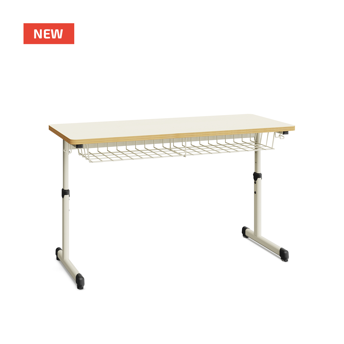Beneath the tabletop, there is a metal wire drawer for storing books and materials, while the powder-coated metal frame includes height adjusters and a levelling system for perfect stability.