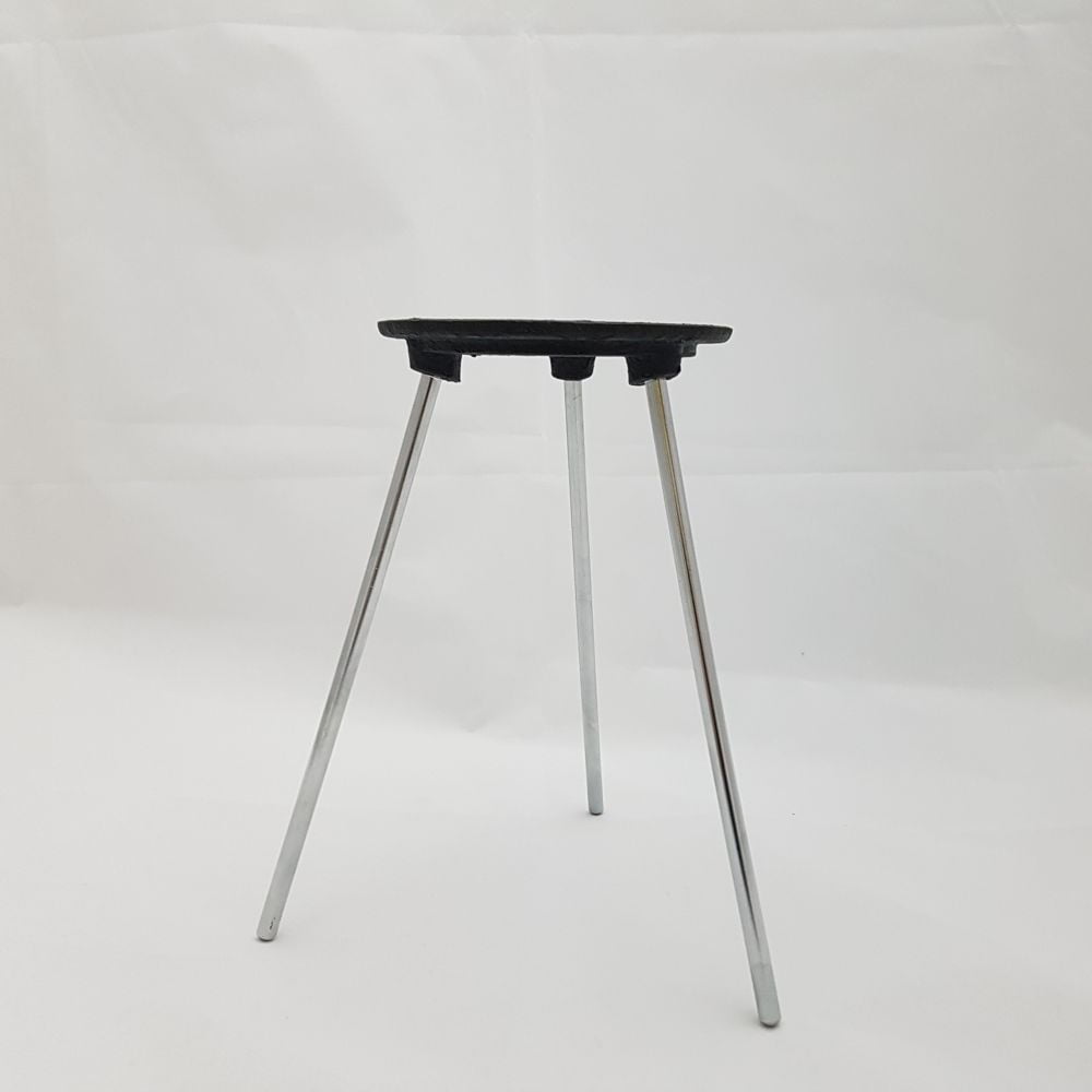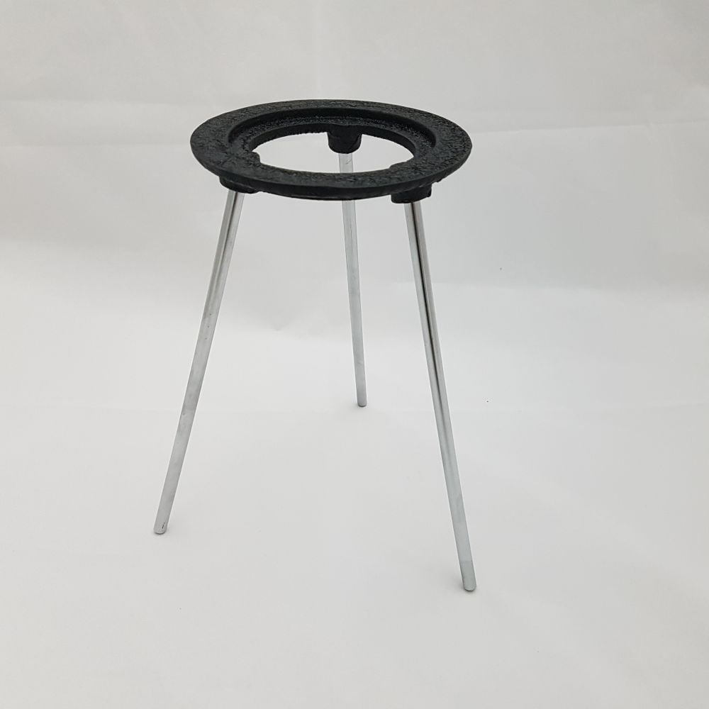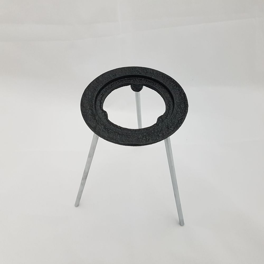 Cast iron support ring with black enamel, acid resistant finish, detachable nickel-plated steel legs angled outward for better stability.